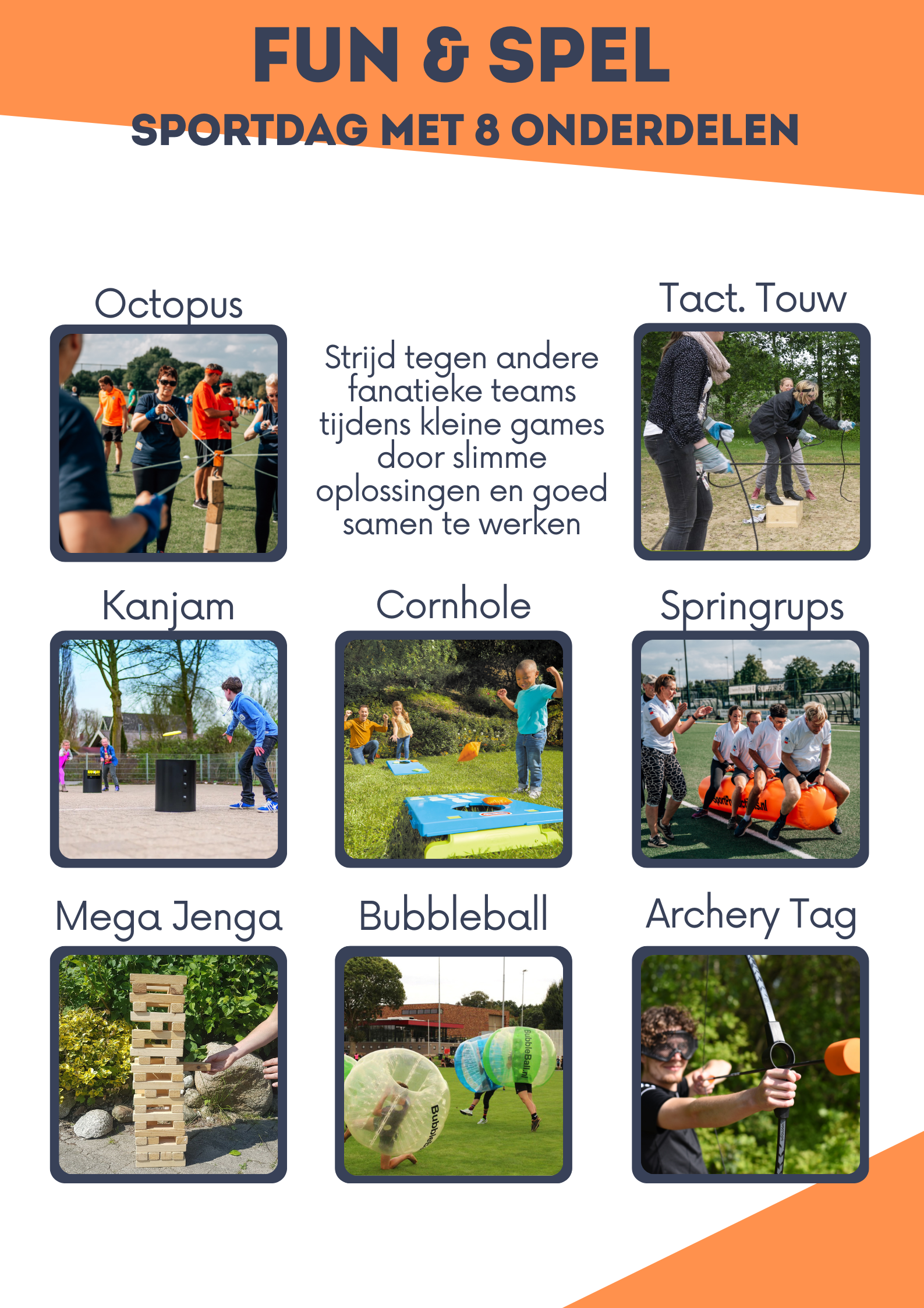 Plezier en lachen staat centraal. Een ontspannen en leuke dag voor alle deelnemers. Iedereen kan mee doen en alle activiteiten zijn gericht op lekker sporten en lachen. 8 verassende onderdelen die inspireren en motiveren voor een onvergetelijke leuke dag! Klik hier om de 8 onderdelen van de fun & spel sportdag te zien.